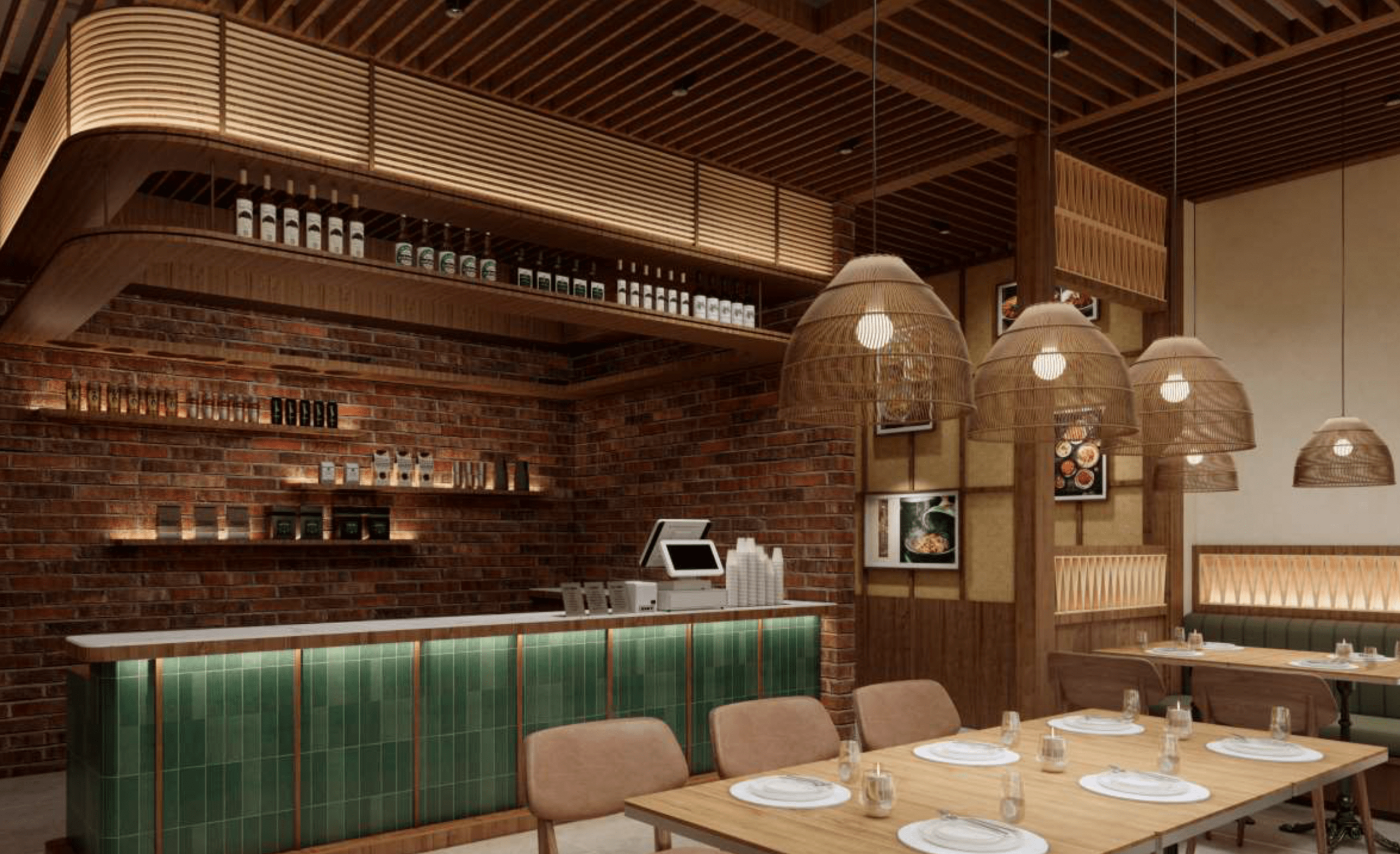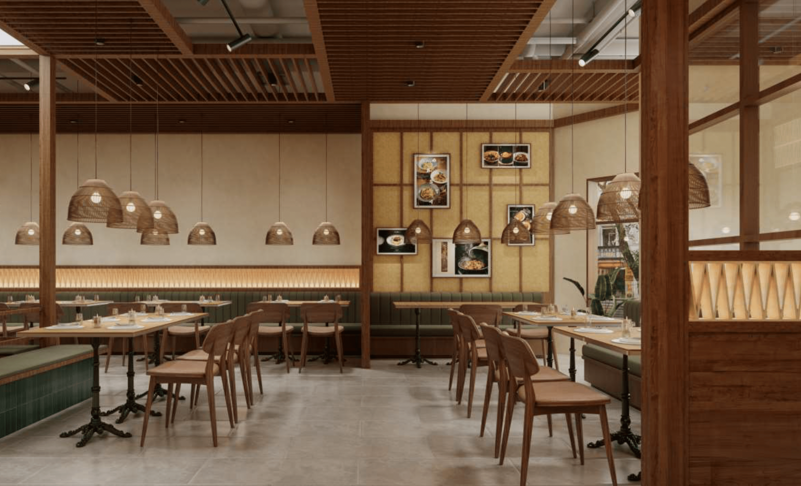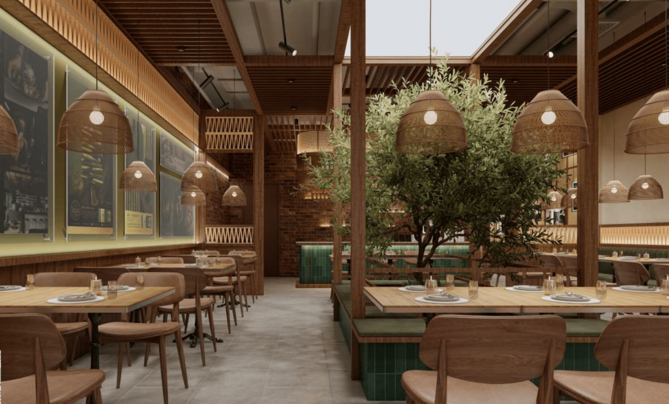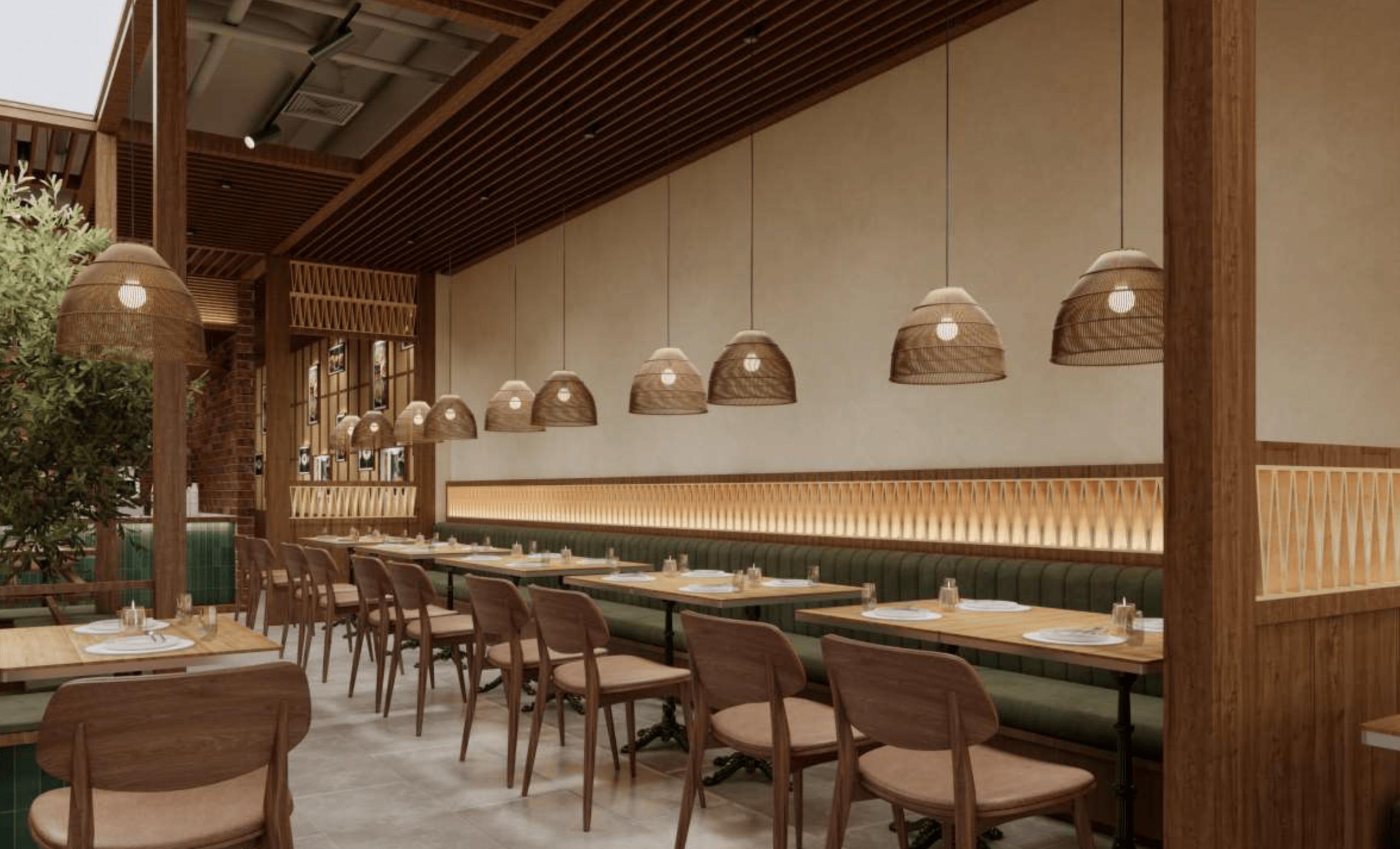 An immersive dining experience inspired by the textures and atmosphere of Vietnam. Natural woods, deep green tones, and a central tree feature create a warm, inviting space that feels both authentic and transportive.